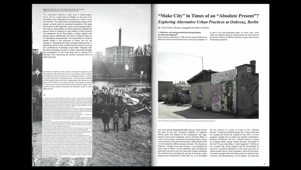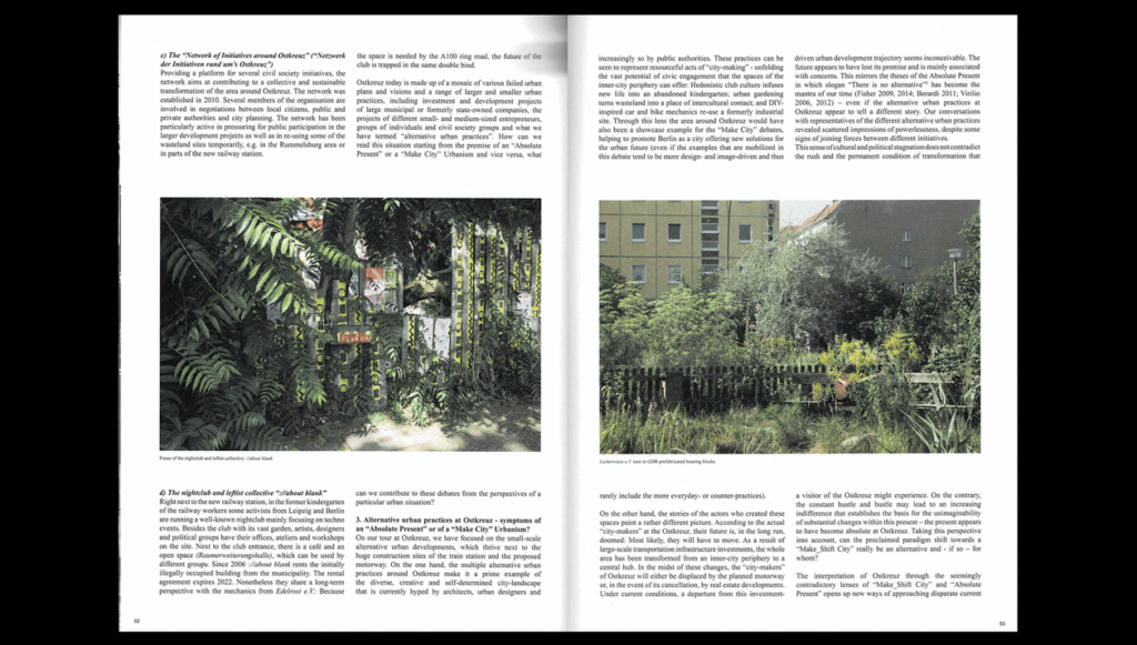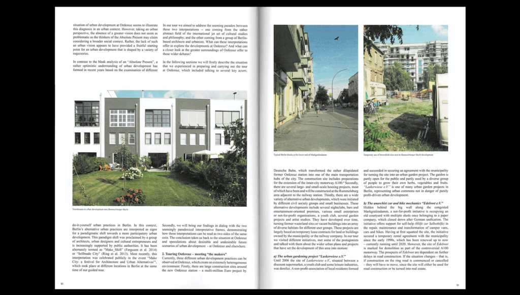 As a contribution to a series of events on the time-agnostic concept of the ‘Absolute Present’ at the Berlin techno club ‘://about blank’ and the Leipzig ‘Institut für Zukunft’, we developed and carried out an explorative city walk around Ostkreuz in Berlin. On our tour, we wanted to explore the hypotheses of an ‘Absolute Present’ on the basis of current urban development practices. On the other hand, we wanted to use this opportunity to reflect on the narrative that emerged in recent years that Berlin is undergoing a paradigm shift towards ‘self-made’ urban development ‘from below’. This approach of bringing together two seemingly paradoxical debates from very different contexts and discussing them using a specific example seemed to us to be a suitable way of sharpening the focus both on the individual debates themselves and the concrete urban development around Ostkreuz. In this magazine article, we present the status of our discussions, illustrated by photographs by Anna Blattner, which were taken on site after the tour.