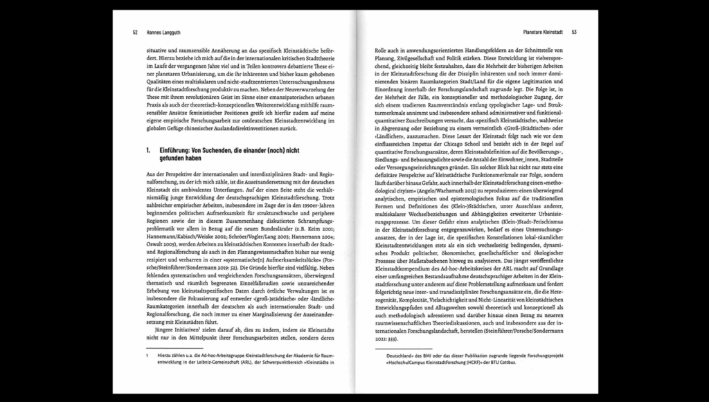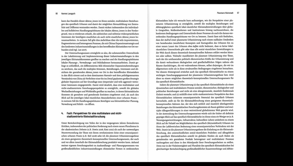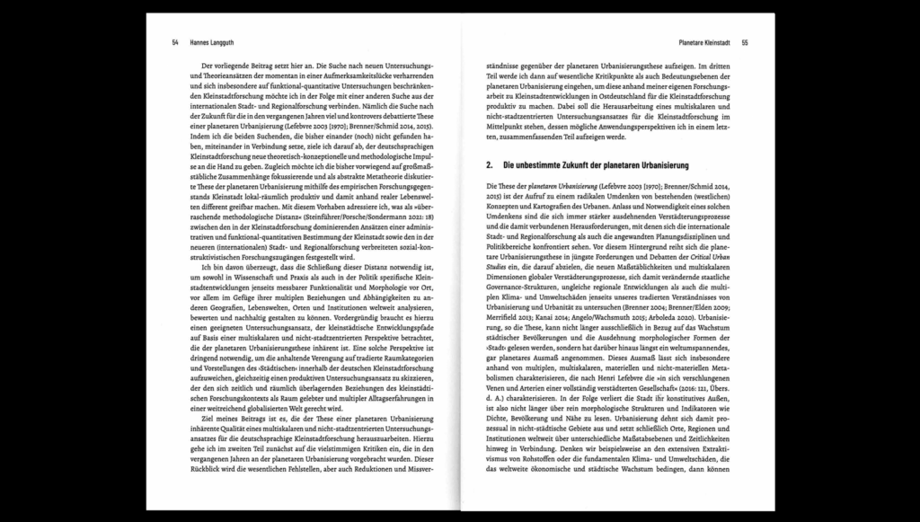 The book chapter (in German) outlines a new conceptual framework that informs interdisciplinary small-town research, addressing the relational nature of locally specific articulations and the global interconnectedness of small towns. The chapter utilises the largely unexplored qualities of a multi-scalar and non-city-centred research framework inherent to the controversially debated concept of ‘planetary urbanisation’. Contrary to recent critiques, the contribution aims at re-rooting the concept with its revolutionary spirit of emancipatory urban practice, following Lefebvre’s assumption that ‘centrality’ is a prerequisite for ‘difference’ and thus for ‘emancipation’. In addition, the chapter builds on spatial theories and feminist perspectives, including Spivak’s understanding of the ‘planetary’, which emphasises to ‘think the other’ and thus the plurality of locally specific and diverse urban realities within the planetary context. Following this, the chapter develops a conceptual framework that promotes a situational and place-sensitive approach to the specific characteristics of small towns, without neglecting their multi-scalar relations in time and space.