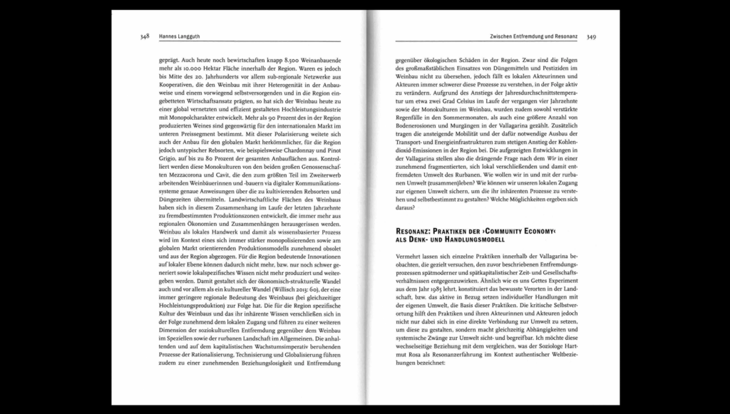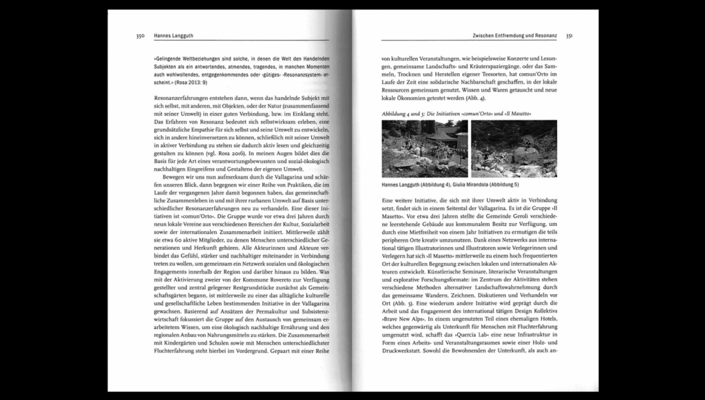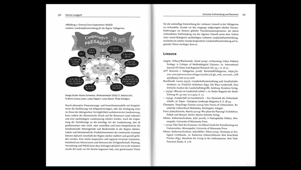 Our individual and collective perception of our built environment is socially constructed, shaping how we interact with, plan, and design it. This book chapter (in German) explores how, amid extensive globalisation and the resulting commodification and urbanisation of rural areas, we are becoming increasingly disconnected and alienated from our environments. Using examples of numerous small-scale initiatives in the Italian Alpine region of Vallagarina, the chapter presents tangible alternatives that experiment with cooperative, community-oriented, and radically ecological forms of living. Drawing on the concept of ‘community economies’, the contribution further advocates for a new socio-ecological model of thought and action that, through the experience of deep resonance with our more-than-human world, forms a foundation for an ethically responsible design and governance of ‘rurban’ landscapes in the face of the global climate crisis.